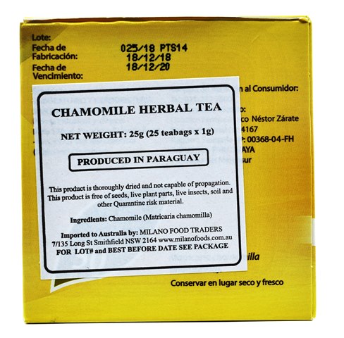 TE GUARANI CAMOMILE HERBAL TEA 25 tea bags Produced by Laboratorio y Herboristeria Santa Margarita SA, Paraguay, one of the most famous and respected companies with major focus on growing variety of herbs and preparation of best quality natural herbal infusions. Camomile tea is well known for its properties to relieve pain and discomfort. CAFFEINE FREE