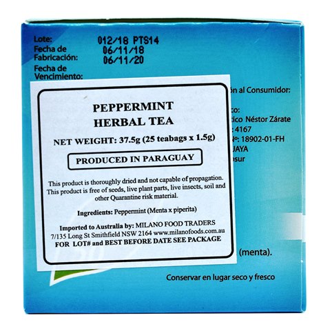 TE GUARANI PEPPERMINT HERBAL TEA 25 tea bagsTE GUARANI PEPPERMINT HERBAL TEA 25 tea bags Produced by Laboratorio y Herboristeria Santa Margarita SA, Paraguay, one of the most famous and respected companies with major focus on growing variety of herbs and preparation of best quality natural herbal infusions. Peppermint tea is an herbal infusion popular for its refreshing and cooling properties. CAFFEINE FREE